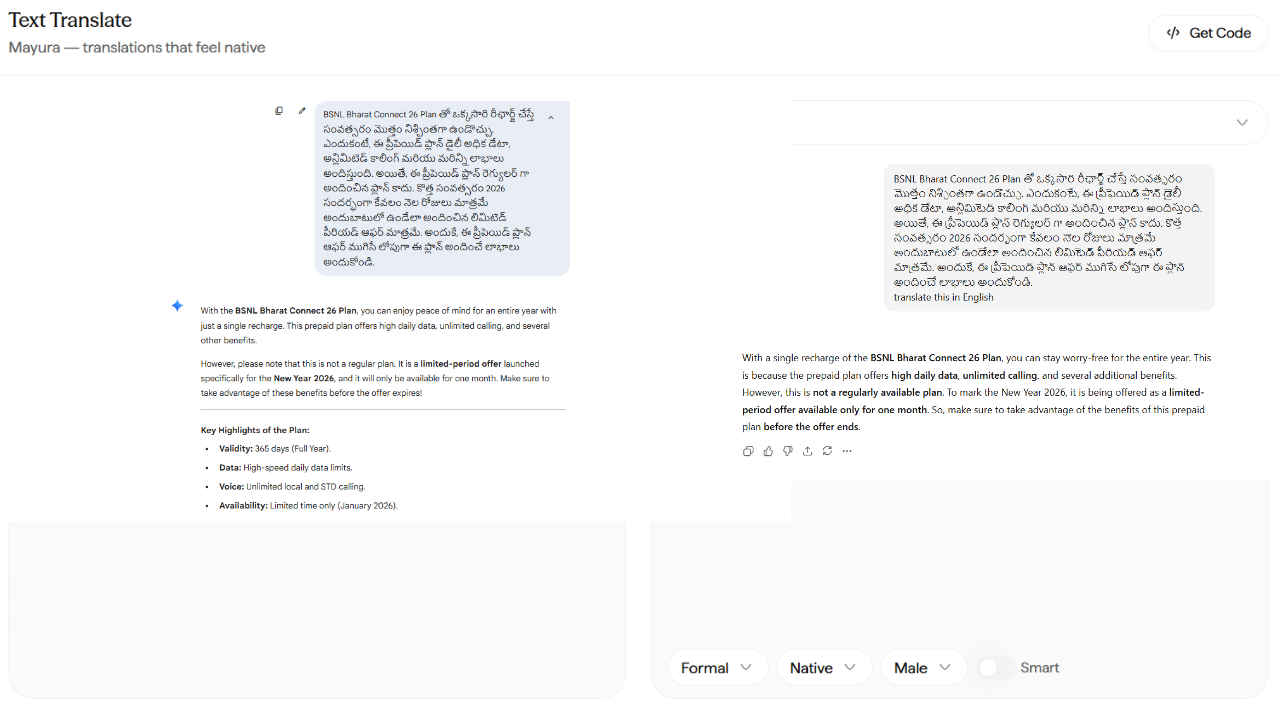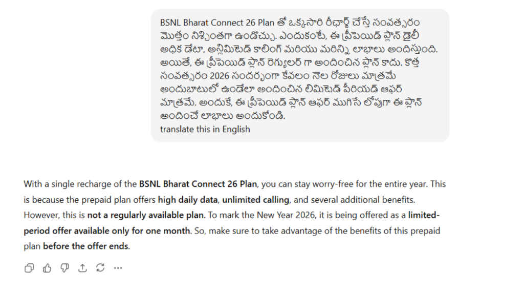 Translation is where Sarvam AI struggled. I provided a Telugu news paragraph, and the translated output contained factual mistakes. In contrast, both ChatGPT and Gemini translated the same content smoothly and accurately, without losing the meaning.