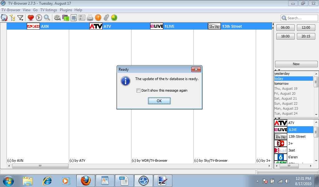 Once you have setup the priorities, click on update now button. Then you are prompted to accept the terms & conditions of use. You proceed by clicking “I agree” twice and the TV-listings download screen is displayed. Once the download is finished, you get the message: “The update of the TV database is ready”. Now, click on OK button and you are done. At this point, a pop-up window prompts you to download the updates for the installed plugins. Select the installed plugin from the list and click on download selected plugins button. You are prompted to restart the TV-Browser for the plugins installation to complete and changes to take effect. That completes the walkthrough for the entire TV-Browser setup, including installation and usage.