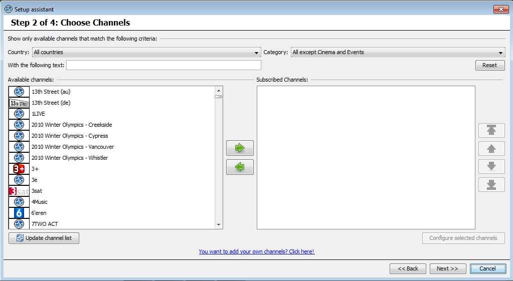 The channel group validation process took a while before presenting us the complete list of downloaded channels. Then you could add a channel to or delete a channel from the subscription using the arrow keys. However, we noticed that some channels did not have their unique channel logo icons downloaded and instead, the default TV-Browser icon was substituted in their place. If a user wished to change the default icon, he could do so by simply selecting the channel and clicking on configure selected channels button. Then click on the custom channel icon button. Once you have customized the channel selection and channel icons, you could proceed with the setup by clicking next.