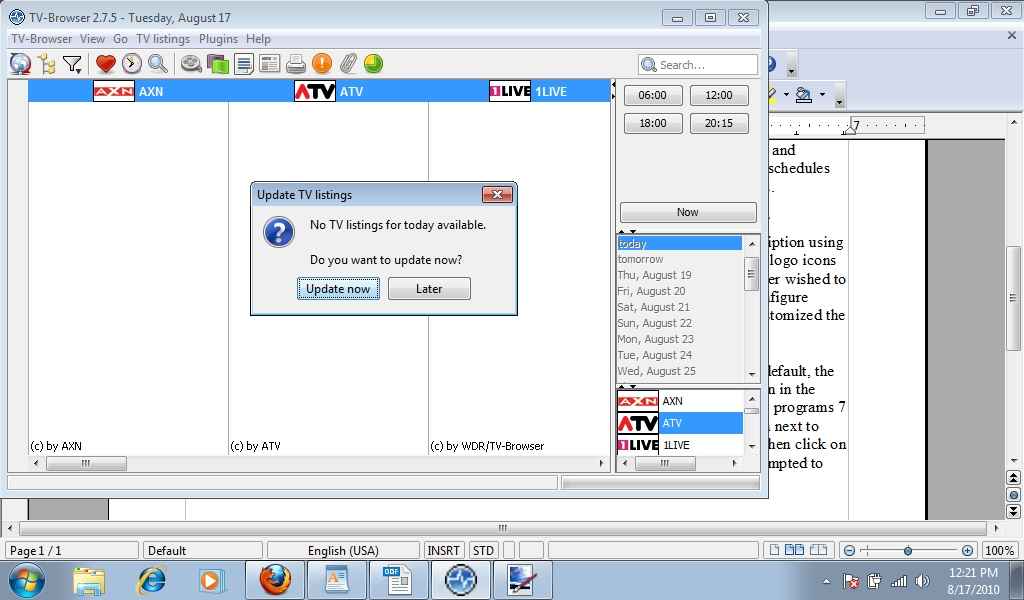 Immediately after closing the setup assistant, you are prompted to update the TV-channel listings, as no TV listings are available for the day. So, click on the “Update Now” button, and you are provided the option to choose the data sources, enable automatic update or TV-Browser startup update or recurrent update based on your priority. Also, you can choose the time or for how many days you want to download the TV-listings (Example: today, up to tomorrow, next 2 days etc.).