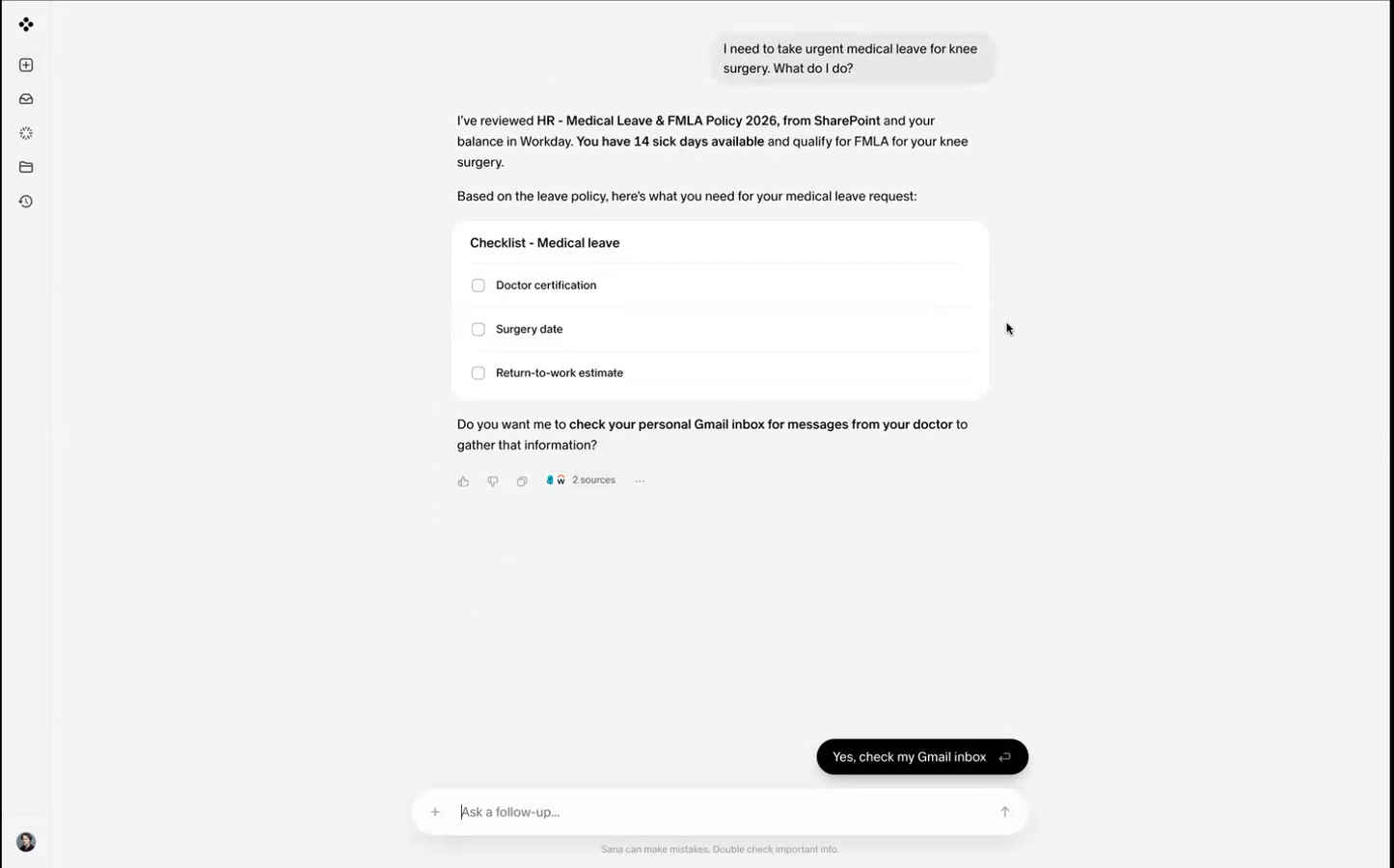 At its core, Sana replaces the traditional menu-driven interface of Workday – the kind where employees click through screens to request leave, update payroll details, or pull a finance report – with a conversational AI experience. Instead of navigating software, you just ask it what you need.