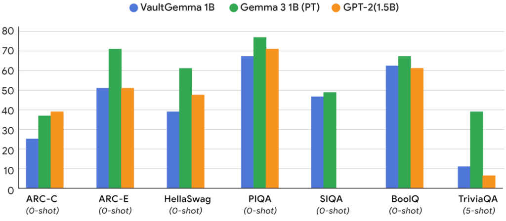 The big question is whether privacy compromises ability. VaultGemma, with around 1 billion parameters, performs surprisingly well across benchmark tests such as HellaSwag, PIQA, BoolQ, and TriviaQA. It does not yet rival state-of-the-art non-private LLMs, but it closes the gap with models from just a few years ago.