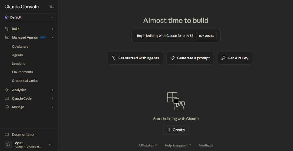 Before anything else, you need credits. Managed Agents don’t run on a regular Claude Pro plan, they live on the developer side of things. Head to the console (platform.claude.com), add some API credits (minimum $5), and you’re good to go. Think of it like a prepaid data plan. The more your agent works, the more data it uses.