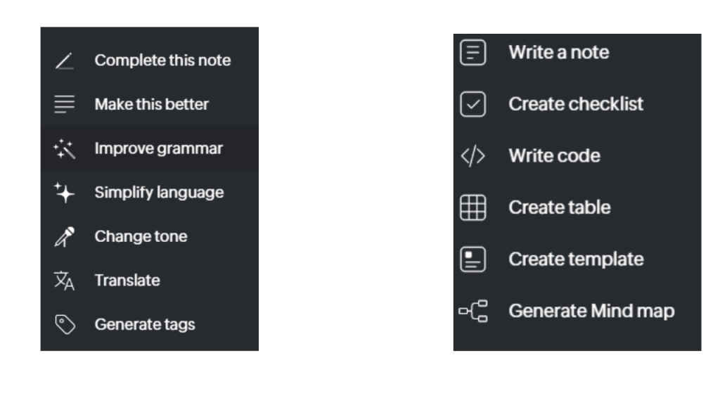 | Generation | Write a note / Write code / Create template | Creates content based on a user prompt. |