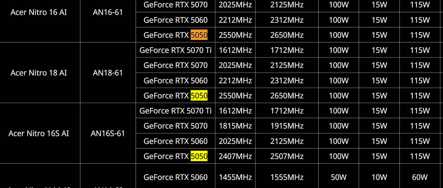 Acer’s “Predator & Nitro GPU Power Specifications” page (from which they removed the 5050 machines later) details five RTX 5050 variants: