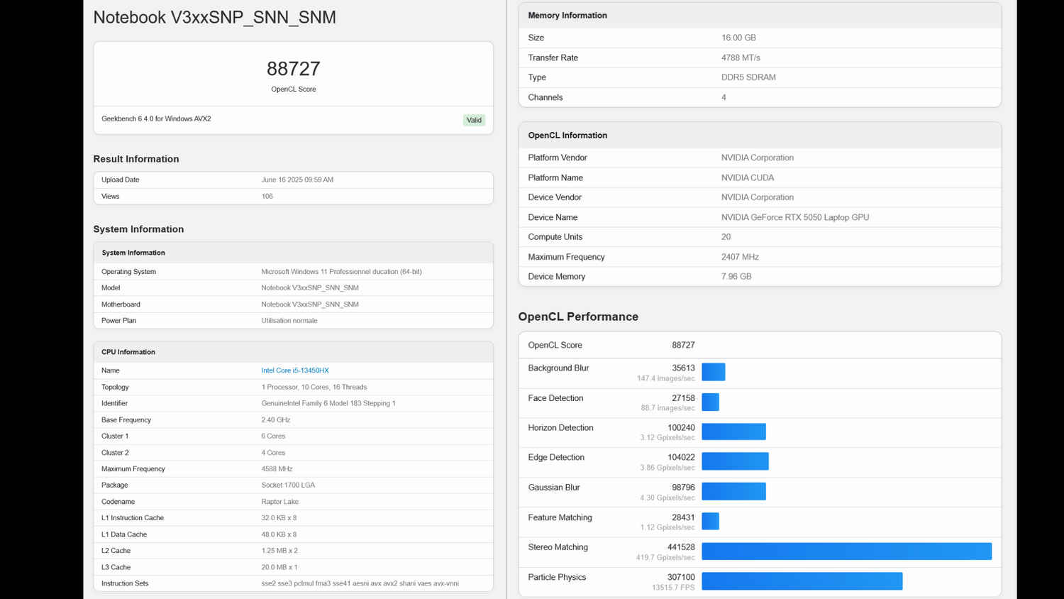 A listing published on 16 June shows the RTX 5050 running at 2.50 GHz and scoring 88,727 points in Geekbench’s OpenCL test, around 11% higher than the average RTX 4050 result of 79,601 points on the same benchmark. The benchmark confirms 20 Streaming Multiprocessors, translating to 2,560 CUDA cores, and it also flags 8 GB of dedicated VRAM, the first time a 50-class mobile part has moved beyond 6 GB.