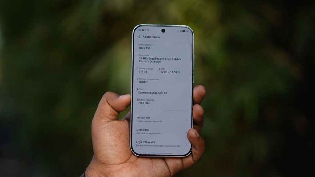 Speaking of the design, iQOO likes to call it a ‘perfect fit’, and that’s not without reason. In the age where smartphones are reaching close to 7 inches, the iQOO 15R is a more practical approach. The smaller 6.59-inch display allows for an overall compact footprint, and the rounded corners ensure that the phone is much more handy.