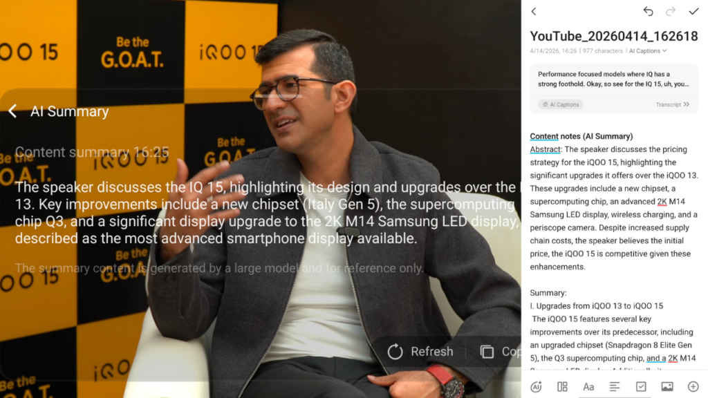 For example, the AI creation in the Notes app gives out real-time transcription, translation, and text summarisation. Not only that, but there’s another super useful feature called AI captions. Once enabled, it records the meeting and, once it’s done, gives you a summarised breakdown of the key points discussed. I found it super useful during the Microsoft Teams work meetings. It expands further, as it is also available during the day-to-day usage of the device.