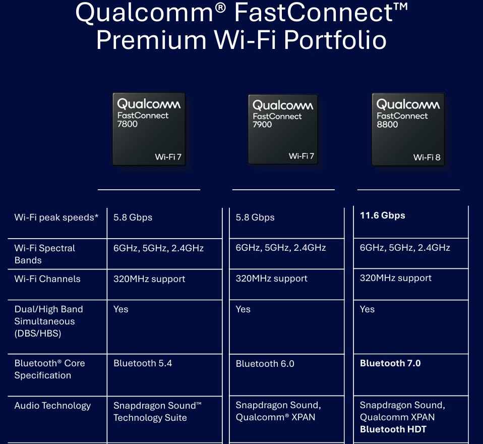 In FastConnect 8800, Qualcomm claims 10+ Gbps peak PHY rates, up to 3x gigabit range, Bluetooth HDT jumping from 2 Mbps to 7.5 Mbps.