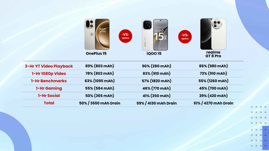 OnePlus 15 vs iQOO 15 vs Realme GT 8 Pro battery drain test: 6 hours, 3 flagships, 1 winner