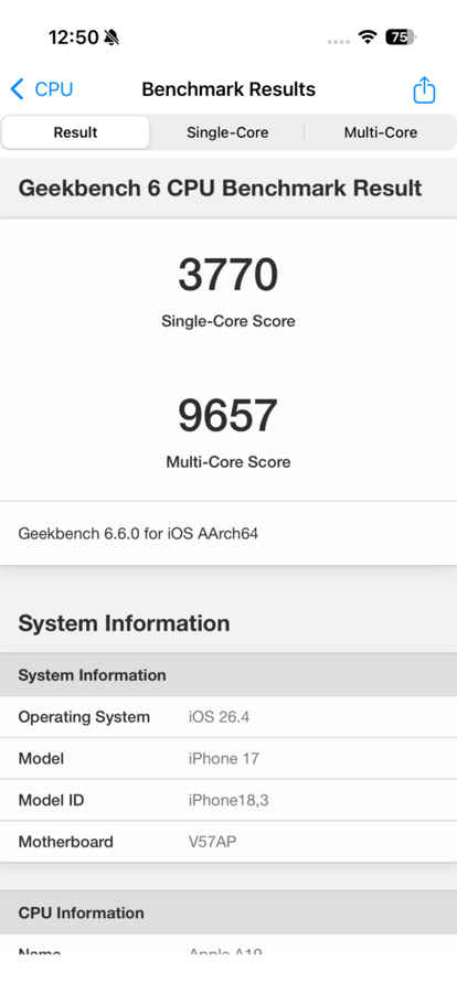 In Geekbench 6, the difference becomes even more interesting. The Galaxy S26 scored around 3,137 in single-core and over 10,000 in multi-core, while the iPhone 17 actually beats it in single-core with 3,770, and comes close in multi-core at 9,657. This tells, for the general stuff, the iPhone 17 is slightly better. But for multi-core heavy tasks, the Galaxy S26 is tuned to handle them better.