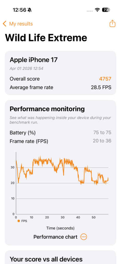 GPU performance also leans towards Samsung. In the 3DMark Wild Life Extreme test, the Galaxy S26 scored 7,201, while the iPhone 17 managed 4,757.