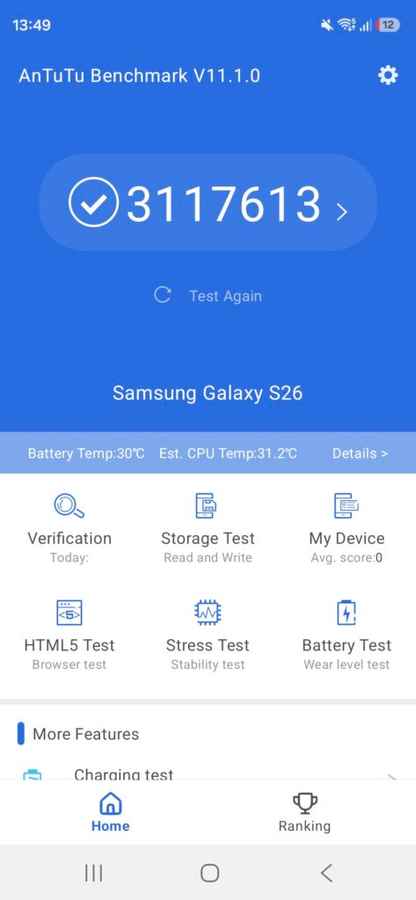 In my testing, the Galaxy S26 scored around 3.1 million on Antutu, while the iPhone 17 was closer to 2.1 million. That’s a huge difference.