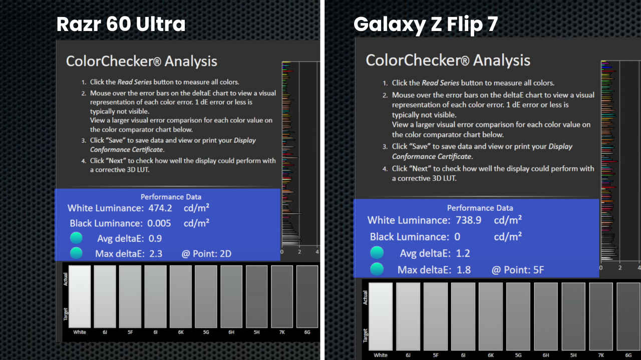 In practice, the difference in resolution isn’t dramatically visible in day-to-day use, but the extra smoothness from Motorola’s 165Hz refresh rate is noticeable, especially when scrolling quickly or gaming. In our brightness tests, both phones crossed 2600 nits in auto mode, making them excellent for outdoor use. In terms of colour accuracy, Motorola scored a delta E of 0.9 in our Calman test, while Samsung came in at 1.2. Both are very accurate, but Motorola edges ahead.