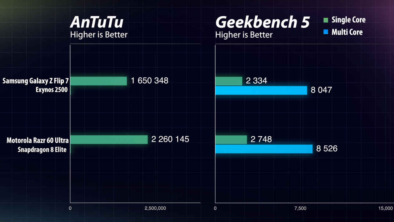 In benchmarks, the Snapdragon 8 Elite flexes its muscles, with the Razr 60 Ultra scoring significantly higher than the Flip 7 in both AnTuTu and Geekbench tests. This means Motorola has the edge in raw performance.