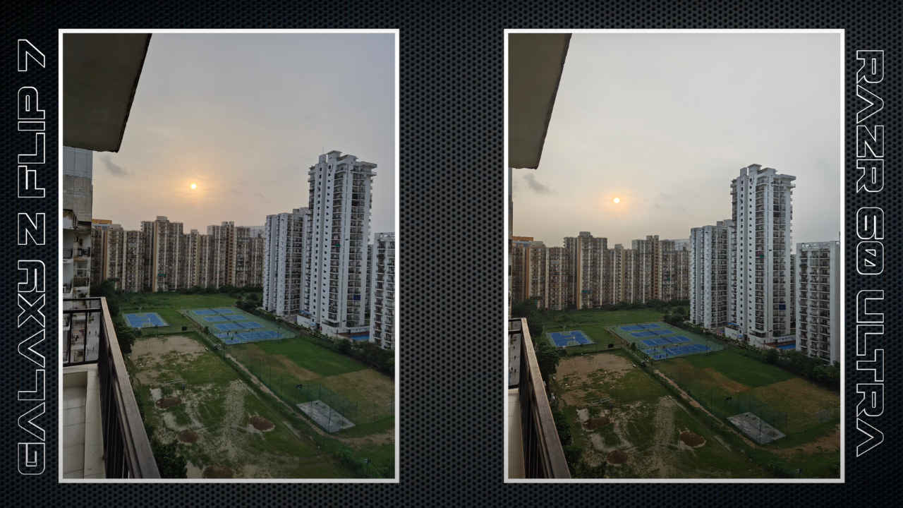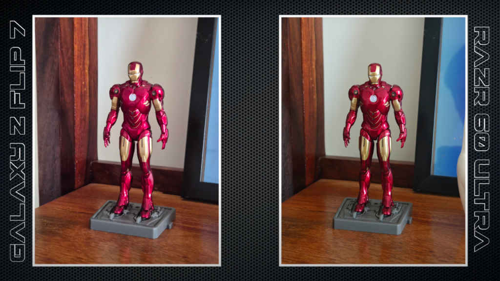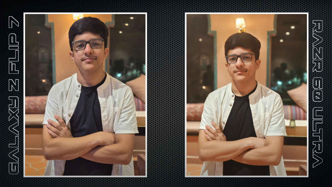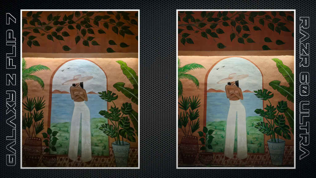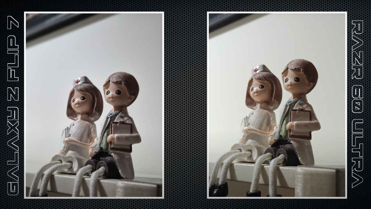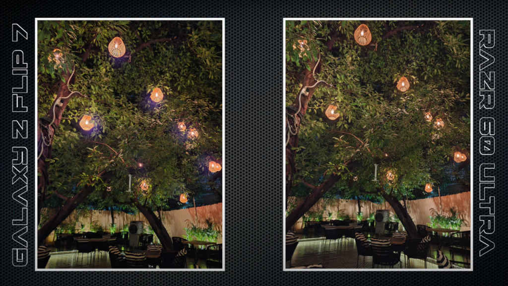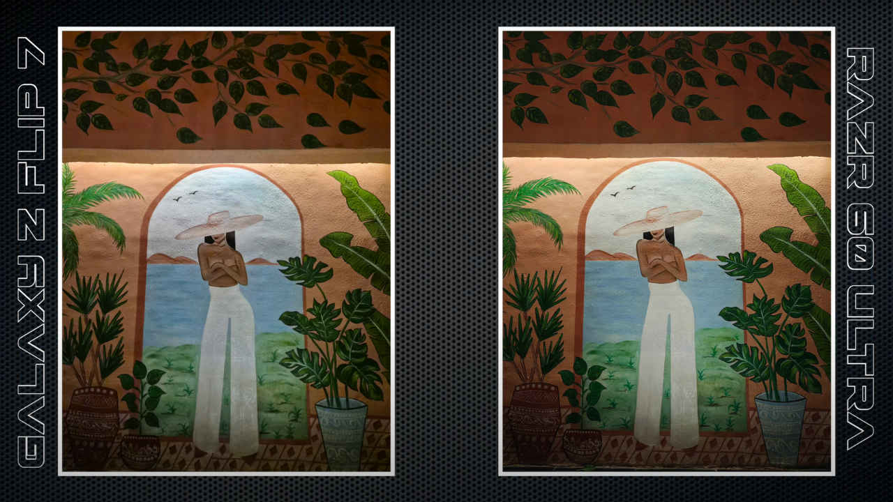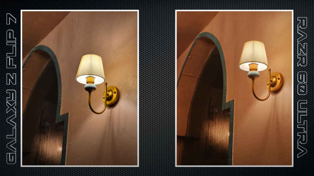 In low-light conditions, the Flip 7 keeps white balance consistent and retains fine details, while the Razr 60 Ultra controls noise well but smooths out textures and sometimes drifts towards yellow tones.