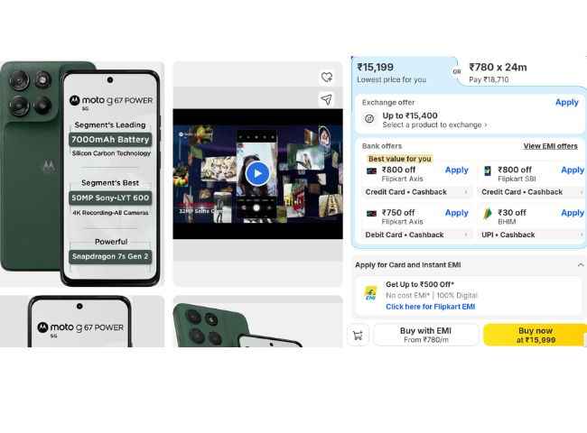 மோட்டோரோலாவின் Moto G67 POWER போனின் விலை விலை பற்றி பேசினால், இந்த போனின் விலை பிளிப்கார்டில் ரூ,15,999 லிஸ்ட்டிங் செய்யப்பட்டுள்ளது அதிலிருந்து ரூ,1000 பேங்க் இன்ஸ்டன்ட் டிஸ்கவுண்ட் பிறகு இந்த போனை வெறும் ரூ,14,999க்கு வாங்கலாம் இதை தவிர Flipkart Axis மற்றும் SBI கிரெடிட் கார்டிலிருந்து வாங்கினால் ரூ,800 இன்ஸ்டன்ட் டிஸ்கவுண்ட் பெறலாம் அதுவே Axis பேங்க் டெபிட் கார்ட் பயன்படுத்தி வாங்கினால் ரூ,750 இன்ஸ்டன்ட் டிஸ்கவுண்ட் பெறலாம் இதை தவிர நீங்கள் இந்த போனை நோ கோஸ்ட் EMI மற்றும் எக்ஸ்சேஞ் ஆபரின் கீழ் இன்னும் குறைந்த விலையில் வாங்கலாம் ஆனால் போனின் கண்டிஷன் பொருத்தது