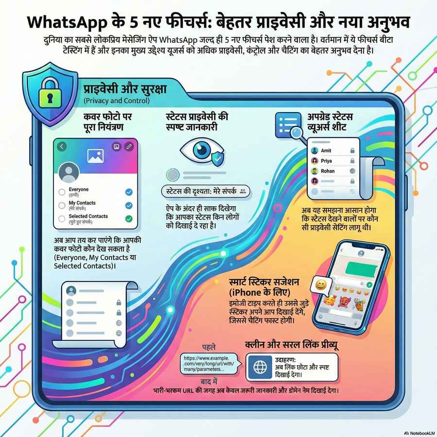 दुनिया की सबसे लोकप्रिय मैसेजिंग ऐप WhatsApp एक बार फिर अपने करोड़ों यूजर्स के लिए बड़े बदलाव करने की तैयारी में है। रिपोर्ट्स की मानें तो जल्द ही व्हाट्सएप में 5 नए फीचर्स को जोड़ दिया जाने वाला है, कंपनी बीटा वर्ज़न में इन 5 नए फीचर्स की टेस्टिंग कर रही है, जिनका मकसद ऐप को सिर्फ आसान नहीं, बल्कि पहले से ज़्यादा प्राइवेट और यूज़र-कंट्रोल्ड बनाना है। ये फीचर्स Android और iOS दोनों ही प्लेटफॉर्म्स पर ट्रायल में हैं और बीटा फेज़ पूरा होते ही स्टेबल अपडेट के साथ सभी यूजर्स तक पहुंचने वाले हैं। आइए इन फीचर्स के बारे में अब एक एक करके जानते हैं।