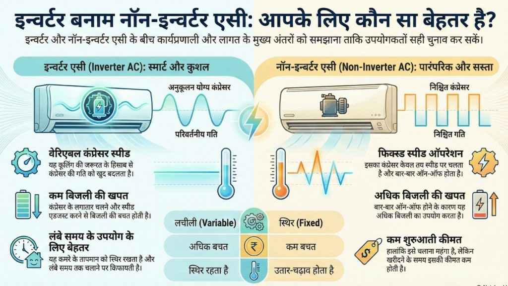 Non-Inverter AC तय स्पीड पर चलता है और बार बार ऑन ऑफ होता है. इससे बिजली की खपत ज्यादा होती है, लेकिन शुरुआती कीमत कम रहती है.