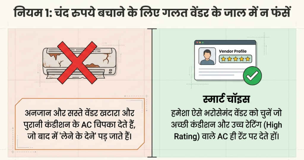 आपको सबसे पहले यह ध्यान रखना है कि आप जहां से एसी रेंट कर रहे हैं वह एक भरोसेमंद वेंडर होना चाहिए। अगर आप पैसे बचाने के चक्कर में किसी गलत वेंडर के चक्कर में पड़ जाते हैं तो इसके एसी के साथ आपको लेने के देने पड़ सकते हैं। ऐसे में आपको जब भी एसी रेंट करना है तो आपको सही वेंडर से ही इसे लेना चाहिए, यह आपको अच्छी कंडीशन और अच्छी रेटिंग वाले एसी ही रेंट पर देते हैं।