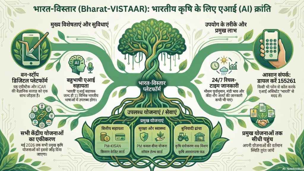 Bharat-VISTAAR (Virtually Integrated System to Access Agricultural Resources) एक AI-पावर्ड, कई भाषाओं में काम करने वाला डिजिटल प्लेटफॉर्म है, जो किसानों को उनकी भाषा में खेती से जुड़ी जरूरी सभी जानकारी देने वाला है। यह AgriStack पोर्टल और ICAR की वैज्ञानिक सलाह को एक साथ जोड़कर एक ही डिजिटल दरवाजा उपलब्ध कराता है।