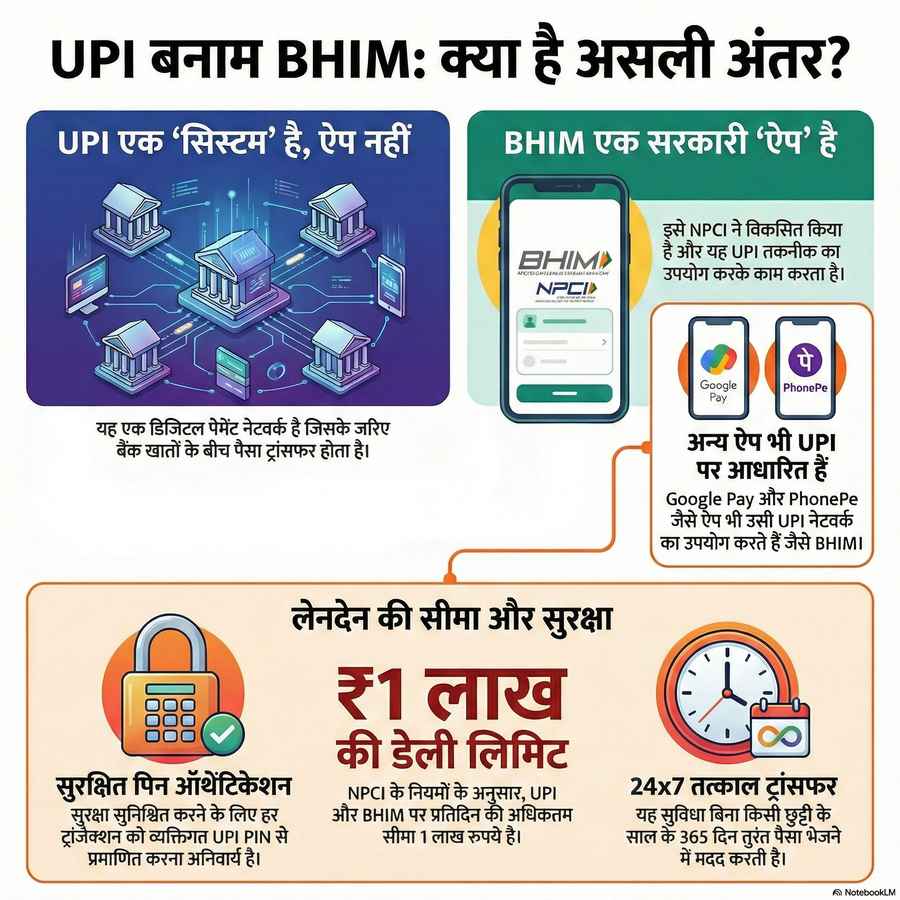 अक्सर रोजमर्रा की बातचीत में लोग BHIM और UPI शब्दों का इस्तेमाल ऐसे करते हैं, जैसे दोनों एक ही चीज हों। कोई कहता है BHIM से पेमेंट कर दिया, तो कोई बोलता है UPI नहीं चल रहा, जबकि असल में दोनों के मतलब अलग-अलग होते हैं। डिजिटल पेमेंट के दौर में यह भ्रम बहुत आम है, क्योंकि लगभग हर ट्रांजैक्शन आज UPI के जरिए ही हो रही है। लेकिन सच्चाई यह है कि BHIM और UPI एक-दूसरे से जुड़े जरूर हैं, मगर दोनों एक जैसे नहीं हैं। अगर आप भी अब तक इन्हें एक ही समझते आए हैं, तो यहां हम आपको आसान भाषा में पूरा फर्क समझाने जा रहे हैं, ताकि भविष्य में आपको इन्हें लेकर कोई भी कन्फ्यूजन न रहे।