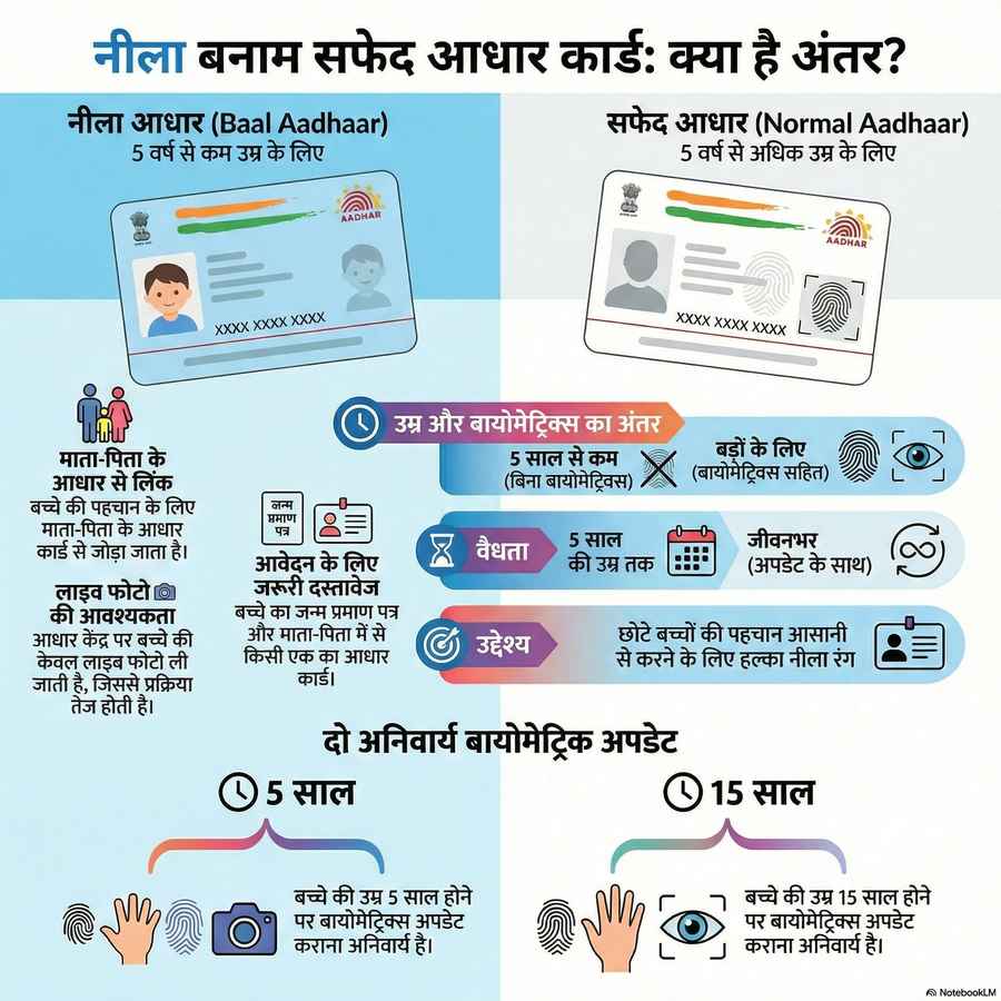 भारत में आधार कार्ड किसी भी नागरिक की पहचान का सबसे अहम दस्तावेज़ बन चुका है। आमतौर पर लोगों के पास जो सफेद रंग का आधार कार्ड होता है, यह सफेद रंग का आधार कार्ड 5 साल से अधिक उम्र के बच्चों और देश के सभी नागरिकों के लिए जारी किया जाता है। लेकिन बहुत कम लोग जानते हैं कि 5 साल से कम उम्र के बच्चों के लिए UIDAI एक अलग तरह का आधार कार्ड जारी करता है, जिसे नीला आधार कार्ड या बाल आधार कहा जाता है। यह कार्ड दिखने में ही नहीं, बल्कि इस्तेमाल और नियमों के मामले में भी सफेद यानि नॉर्मल आधार कार्ड से पूरी तरह से अलग होता है।