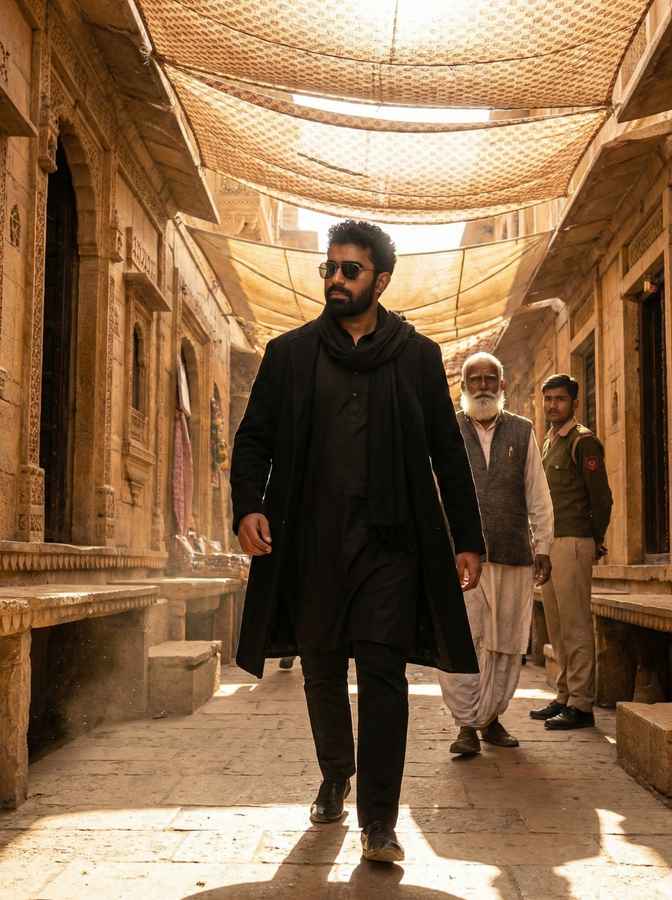 Prompt: Create an ultra-realistic, cinematic full-body portrait using the uploaded reference image. Preserve facial identity, sharp eyebrows, and beard. Action: Walking forward with purpose, dramatic entrance in slow motion. Outfit: Black kurta, long black overcoat, black scarf, dark sunglasses. Lighting: Golden sunlight streaming through patterned fabric canopies overhead. Supporting characters: An elderly man with a white beard and a younger guard following closely. Environment: Ancient sandstone marketplace. Camera: Low-angle cinematic shot.