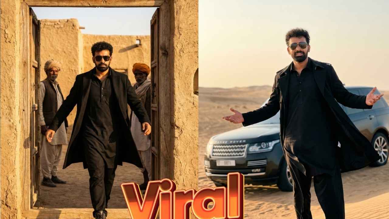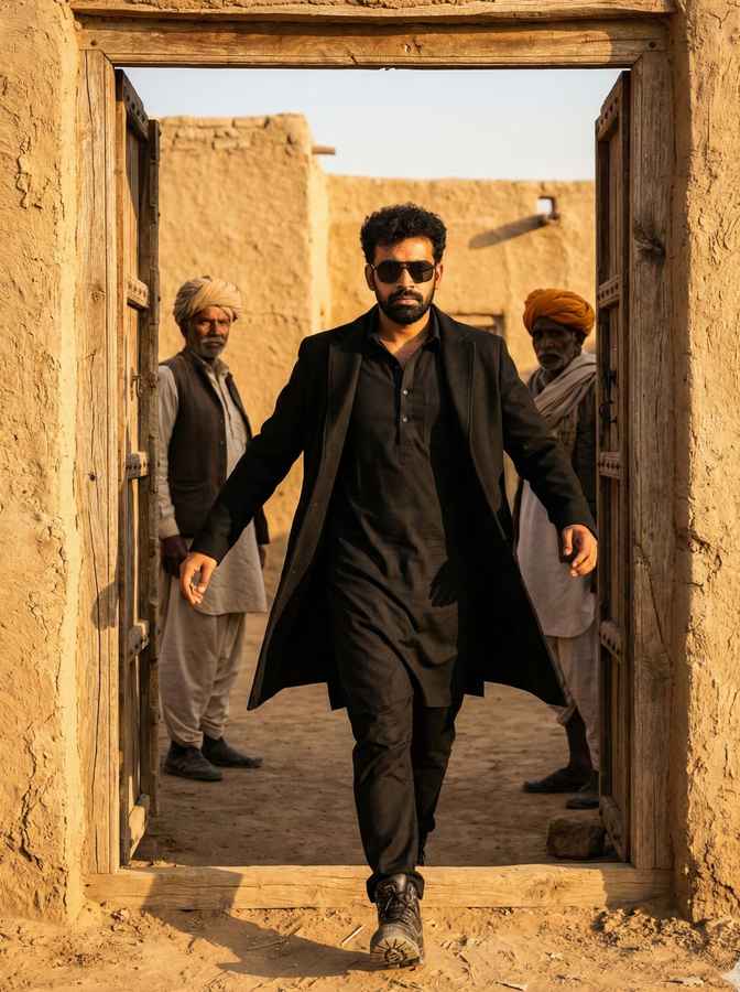 Prompt: Create an ultra-realistic, cinematic full-body portrait using the uploaded reference image. The main subject must look exactly like the person in the reference photo. Scene setting: A rustic desert village with mud-brick walls. Outfit: All-black outfit inspired by Rahman Dakait, long black coat over black kurta, dark sunglasses. Pose: Stepping forward confidently from a wooden doorway, arms slightly extended. Background: Two men in traditional ethnic attire standing behind. Lighting: Warm desert sunlight, cinematic and high contrast. Visuals: Ultra-realistic, 8k resolution.