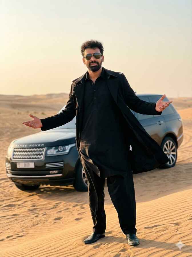Prompt: Create an ultra-realistic, cinematic full-body portrait using the uploaded reference image. Preserve facial identity. Scene: Open desert landscape with sand dunes. Outfit: All-black kurta layered with a long black coat, dark sunglasses reflecting light. Pose: Standing confidently, hands open in a relaxed “what can I say” gesture. Background element: A luxury SUV parked behind at an angle. Lighting: Cinematic soft warm desert tones, wind moving the coat. Visual quality: Shallow depth of field, 4K cinematic frame.