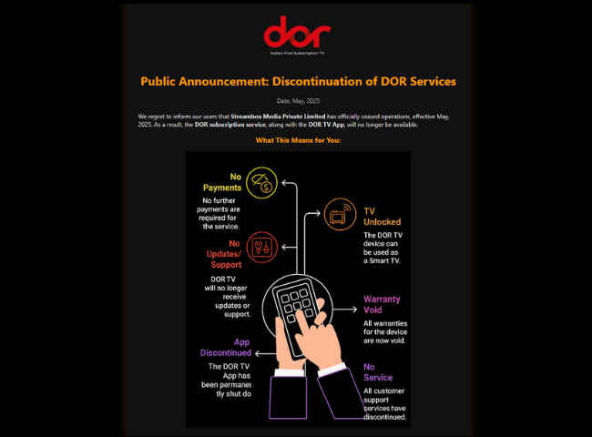 आज से लगभग 8 महीने पहले, Streambox Media ने भारत में एक अनूठी सेवा शुरू की थी, इसे कंपनी ने Dor TV, देश का पहला सब्सक्रिप्शन-बेस्ड स्मार्ट टीवी मॉडल कहा था। इस टीवी और इसकी सेवाओं ने लॉन्च के समय खूब सुर्खियां बटोरी थीं, लेकिन अब, मई 2025 से कंपनी ने भारत में अपनी सभी सेवाएं आधिकारिक रूप से बंद कर दी हैं। Streambox Media की वेबसाइट पर एक संक्षिप्त मैसेज “Public Announcement: Discontinuation of DOR Services” के साथ यह घोषणा की गई कि Dor TV की सब्सक्रिप्शन सेवाएं और Dor Play ऐप बंद हो चुके हैं। इस खबर ने उन सभी ग्राहकों को चिंता में डाल दिया है, जिन्होंने इस टीवी और सेवा में निवेश किया था। आइए, इस मामले को विस्तार से समझते हैं और यह भी जानते हैं कि क्या नई कंपनियों पर भरोसा करना सही निर्णय है, या ये लूटने का एक धंधा बन चुका है?