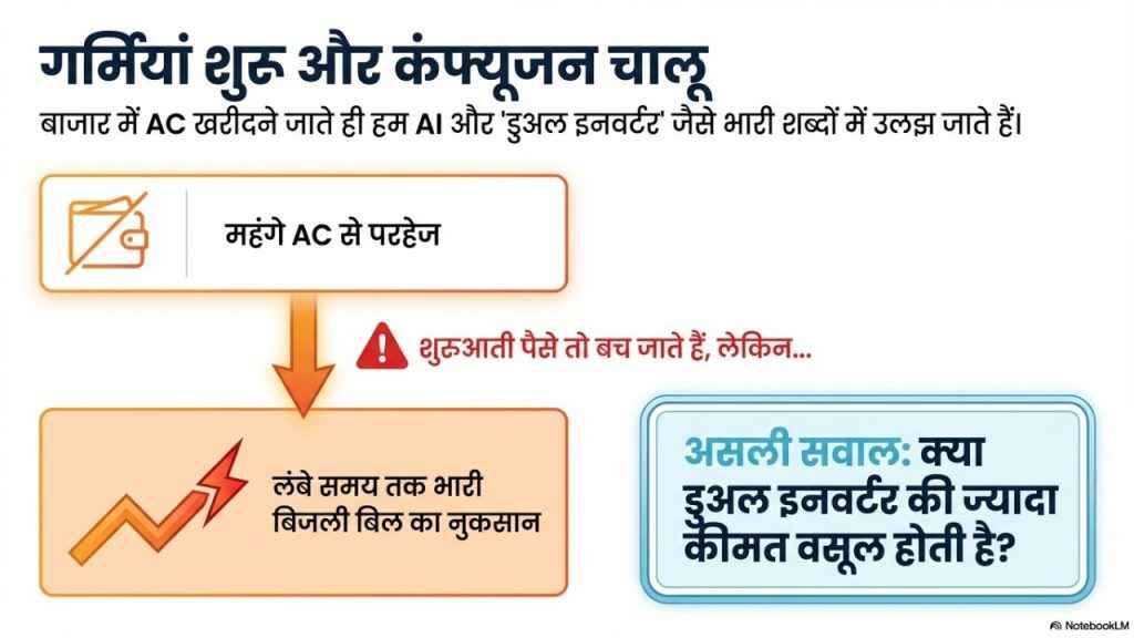 गर्मियां शुरू होते ही सभी लोग कूलर या एसी खरीदने के लिए दौड़ पड़ते हैं। बाजार में पहुँचने के बाद उन्हें कई नई तकनीकी के बारे में जानकारी मिलती है, कुछ ज्यादा तकनीकी वाले एसी कुछ महंगे में मिलते हैं। ऐसे में ज्यादा कीमत के चलते लोग उन्हें खरीदते ही नहीं है, ऐसे में वह पैसे तो बचा लेते हैं लेकिन उनका बिजली की खपत का जो नुकसान होता है, उसे उन्हें लंबे समय के लिए झेलना पड़ता है। असल में, जब आप बाजार में एसी खरीदने जाते हैं तो जाहिर है कि आपको बहुत से AI फीचर्स इस समय AC आदि में मिलने वाले हैं, लेकिन एक फीचर ऐसा जिसके बारे में लगभग लगभग सब कन्फ्यूज रहते हैं। जैसे डुअल इनवर्टर AC क्या होता है। इस तकनीकी की क्या जरूरत है। इसके अलावा इसकि एक एसी में क्या जरूरत होती है, साथ साथ यह कि आखिर नॉर्मल एसी के मुकाबले यह कितने अलग होते हैं। आज हम आपको दोनों के बीच के अंतर को बताने वाले हैं। आइए जानते हैं कि आखिर डुअल और इनवर्टर एसी में क्या अंतर होता है। इसके अलावा सबसे बड़ा सवाल क्या यह वाकई आपके बिजली के बिल को कम करता है। आइए जानते हैं।