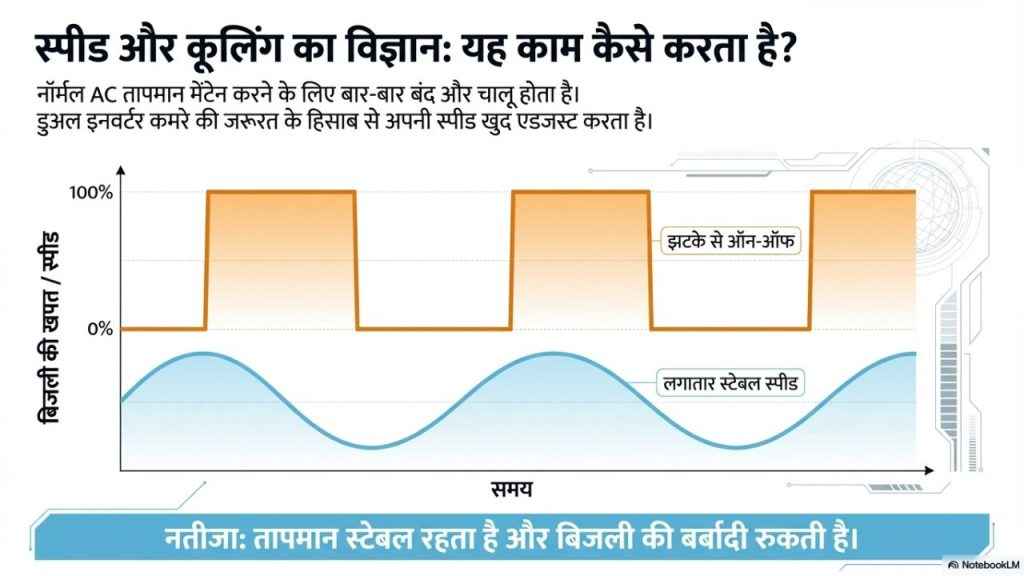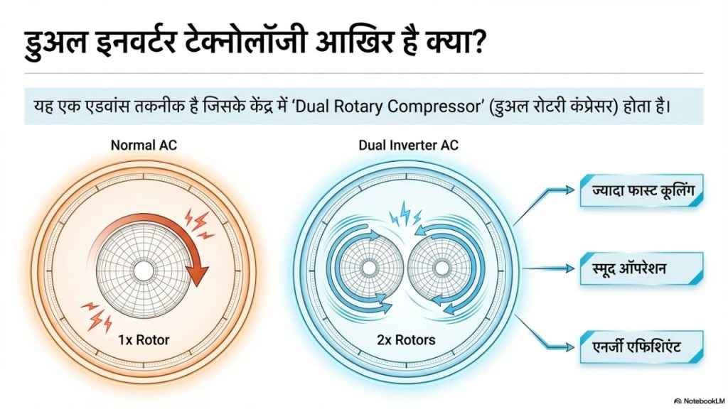 ड्यूल इनवर्टर AC एक एडवांस टेक्नोलॉजी वाला AC होता है, जिसमें Dual Rotary Compressor लगा होता है। इसका मतलब है कि इसमें एक नहीं बल्कि दो रोटर होते हैं, जो कूलिंग को ज्यादा फास्ट, स्मूद और एनर्जी एफिशिएंट बनाते हैं। इसके अलावा यह यह AC कमरे के तापमान के हिसाब से अपनी स्पीड कम-ज्यादा करने में भी सक्षम होते हैं। ऐसा होने से अपना आप ही: बिजली कम खर्च होती है, कूलिंग लगातार मिलती रहती है, तापमान स्टेबल रहता है।
