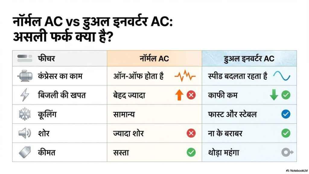 यहाँ डुअल इनवर्टर एसी और नॉर्मल एसी के बीच अंतर दिया गया है।