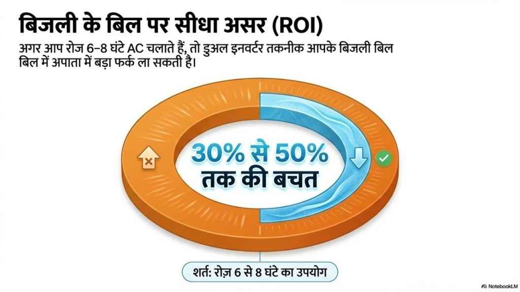 अगर आंकड़ों को देखा जाए तो नॉर्मल एसी के मुकाबले डुअल इनवर्टर एसी 30% से 50% तक बिजली की खपत को कम कर देता है। उदाहरण के लिए अगर आप रोज AC को 6–8 घंटे चलाते हैं, तो बिजली बिल में बड़ा फर्क देखने को मिलने वाला है। इसके अलावा डुअल इनवर्टर एसी बिल्कुल भी शोर नहीं करता है, ऐसे में अगर आप सो रहे हैं तो आपको दिक्कत कम होती है। लंबी लाइफ के साथ साथ यह फास्ट कूलिंग के लिए भी माहिर एसी होते हैं।