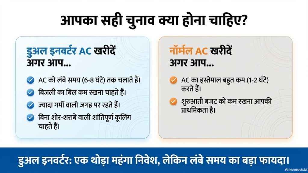 आपको डुअल इनवर्टर एसी खरीद लेना चाहिए, अगर आप अपने एसी को लंबे समय तक चलाते हैं। अगर आप ऐसा करके भी अपना बिजली का बिल कम रखना चाहते हैं तो यह आपके लिए बेस्ट हो सकता है। इसके अलावा अगर आप बिना किसी शोर शराबा करने वाले एसी को खरीदना चहते हैं तो भी आपको डुअल इनवर्टर एसी खरीद लेना चाहिए। अगर आप ज्यादा गर्मी वाली जगह पर रहते हैं तो आपके लिए फास्ट और स्टेबल कूलिंग के लिए डुअल इनवर्टर एसी बेस्ट हो सकता है।