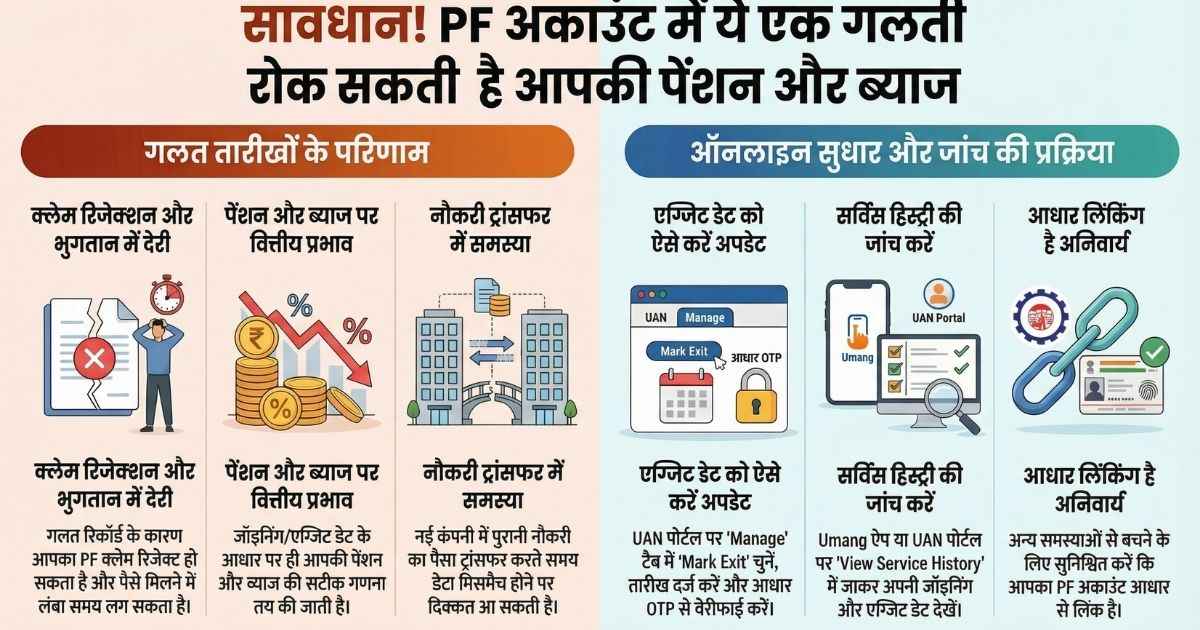 EPFO PF Account Update News: हमारे देश में एक बड़ी जनसंख्या नौकरी करती है। अब अगर आप निजी कंपनियों के साथ काम करते हैं तो जाहिर तौर पर आपका PF कटता होगा। अगर यह सब हो रहा है तो यह खबर आपके लिए बेहद ही ज्यादा जरूरी और जानकारी भरी हो सकती है। असल में, EPFO की ओर से सोशल मीडिया पर एक पोस्ट जारी करके PF Account Holders को एक चेतावनी दी है। यहाँ सभी PF Account धारकों से यह कहा गया है कि अगर आपके जॉइनिंग डेट के साथ साथ अगर एग्जिट डेट में किसी भी प्रकार की कोई दिक्कत या छोटी सी भी कोई गलती है तो भविष्य में आपके लिए यह परेशानी खड़ी कर सकता है। इसका मतलब है कि पेंशन और उसपर मिलने वाले ब्याज के पैसों से मिलने वाले फायदे कहीं न कहीं प्रभावित हो सकते हैं। इसी कारण अभी चेक कर लीजिए और अगर आपको कोई भी गलती मिलती है तो उस गलती को आपको अभी के अभी सुद्धा लेना चाहिए। आइए जानते हैं कि आखिर आप PF Account की इस गलती को कैसे सुधार सकते हैं। यहाँ हम आपको सम्पूर्ण जानकारी डीटेल में देने वाले हैं।
