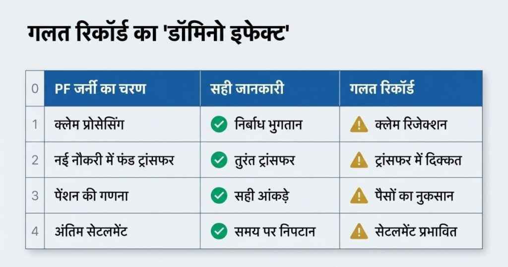अब एक अहम सवाल है यहाँ पर उठता है जो शुरू से ही आपके लिए बेहद जरूरी है कि अगर किसी भी कारण यह दोनों ही डेट गलत है तो क्या नुकसान हो सकते हैं। क्या आपके PF के पैसे पर रोक लग सकती है या आपको कोई अन्य दिक्कत आ सकती है। यहाँ हम आपको सभी परिणाम यहाँ बताने वाले हैं कि आखिर हो क्या क्या सकता है।