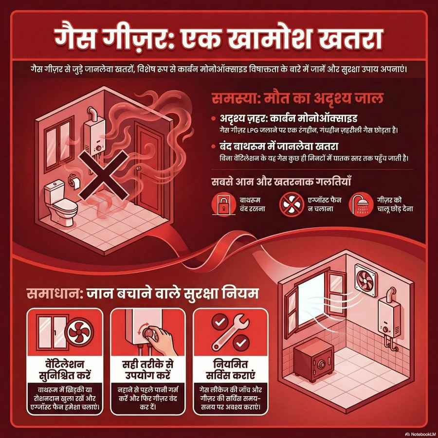 भारत के अलग-अलग हिस्सों से हर कुछ महीनों में एक जैसी खबरें सामने आती हैं। बाथरूम में नहाते समय गैस गीजर से निकली जहरीली गैस, दम घुटना और फिर अचानक बाथरूम में नहाने वाले की मौत हो जाना। ये खबरें चौंकाती जरूर हैं, लेकिन कुछ दिनों बाद भुला दी जाती हैं। यही भूल सबसे खतरनाक है। क्योंकि गैस गीजर कोई अचानक खराब होने वाली मशीन नहीं, बल्कि एक ऐसा खामोश खतरा है, जो ज़रा-सी लापरवाही पर जान ले सकता है।