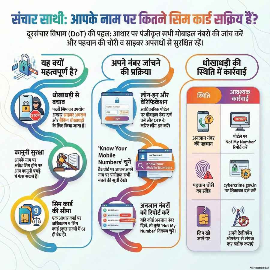 Sanchar Saathi, Department of Telecommunications (DoT) की एक सरकारी पहल है। इसका मकसद मोबाइल यूजर्स को पारदर्शिता और सुरक्षा देना है। यह पोर्टल आपको यह सुविधा देता है कि आप अपने नाम पर रजिस्टर्ड सभी मोबाइल कनेक्शंस की पूरी लिस्ट देख सकें।