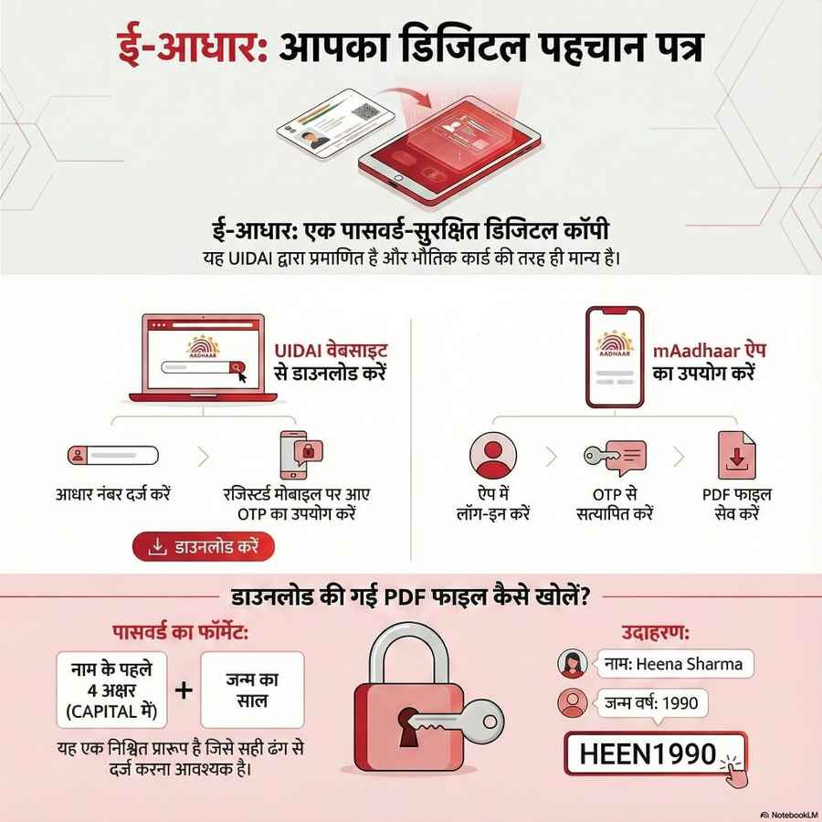 डाउनलोड करने के बाद अगर PDF फाइल तुरंत न खुले, तो घबराने की जरूरत नहीं है। e-Aadhaar फाइल सुरक्षा के लिए पासवर्ड से लॉक होती है। इसका पासवर्ड बहुत आसान होता है। आपके नाम के पहले चार अक्षर (कैपिटल लेटर में) और उसके बाद आपका डेट ऑफ बर्थ दर्ज करना होगा। उदाहरण के लिए, अगर आपका नाम राहुल है और जन्म वर्ष 1995 है, तो पासवर्ड होगा ‘RAHU1995’। एक बार खुलने के बाद आप इसे कहीं भी डिजिटल रूप में इस्तेमाल कर सकते हैं, बिना फिजिकल कॉपी को अपने साथ रखे।