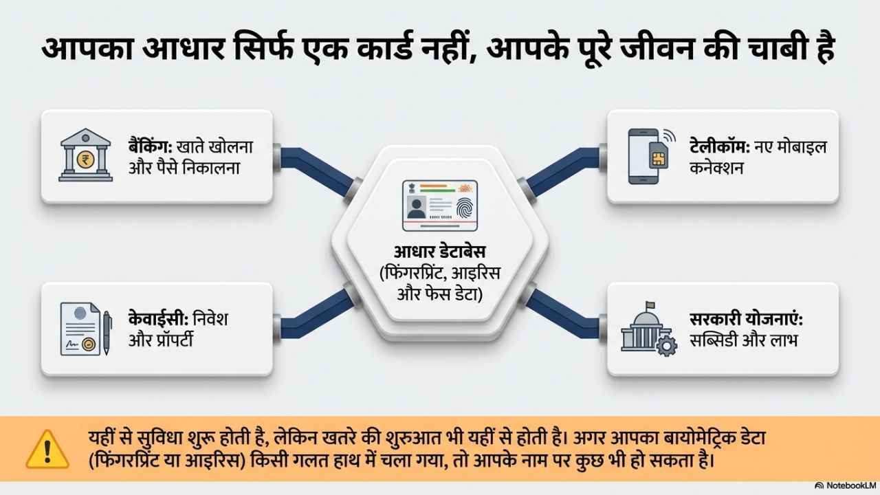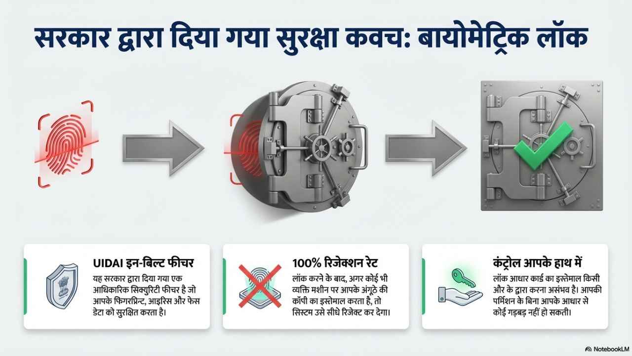 आज के समय में आधार कार्ड सिर्फ एक पहचान पत्र नहीं रहा, बल्कि बैंक, सिम कार्ड, सरकारी योजना, KYC आदि के अलावा लगभग हर जरूरी काम में इसका इस्तेमाल होता है। यहीं से खतरे की भी शुरुआत होती है क्योंकि अगर किसी तरह आपका बायोमेट्रिक डेटा (फिंगरप्रिंट या आइरिस) किसी गलत हाथ में चला गया, तो आपके नाम पर गलत काम भी हो सकते हैं। इसलिए सरकार ने एक बहुत जरूरी फीचर को आधार कार्ड के साथ बहुत पहले ही जोड़ ड़िया था, इसे हम Aadhaar Biometric Lock के तौर पर जानते हैं। आज हम आपको इसके बारे में बताने के साथ साथ यह भी बताने वाले हैं कि इसके फायदे क्या होता हैं और इसे कैसे एक्टिवेट किया जा सकता है। इसके अलावा इससे जुड़े कई सवालों के जवाब भी आपको मिलने वाले हैं।