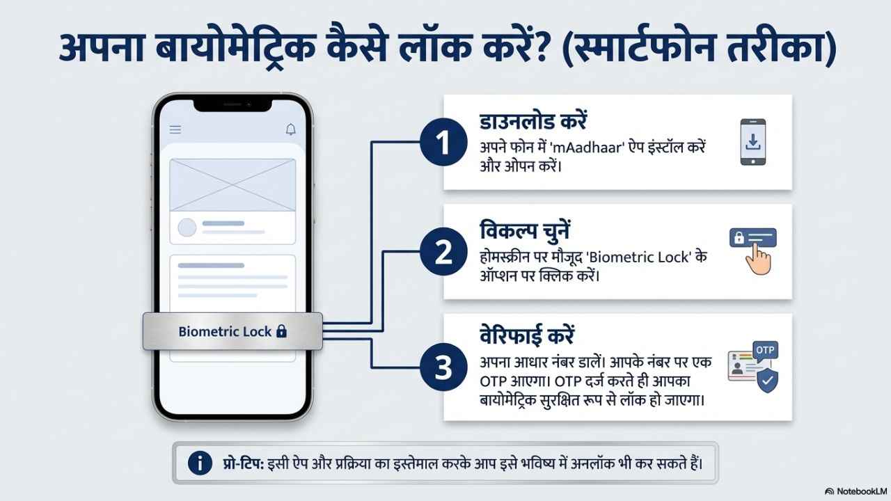 अगर आप मोबाइल से करना चाहते हैं, तो mAadhaar ऐप डाउनलोड करें। ऐप खोलते ही आपको Biometric Lock का ऑप्शन नजर आने वाला है। इसपर क्लिक करें, अपना आधार नंबर डालें, इसके बाद आपको एक OTP मिलने वाला है, जैसे ही आप इस OTP को दर्ज करते हैं तो आपका बायोमेट्रिक लॉक हो जाता है। बिल्कुल ऐसे ही आप इसे mAadhaar App से अनलॉक भी कर सकते हैं।