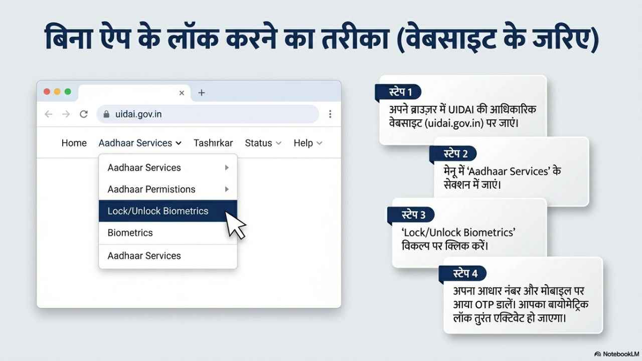 अगर आप ऐप का इस्तेमाल नहीं करते हैं तो आप वेबसाइट पर जाकर भी ऐसा कर सकते हैं। इसके लिए आपको UIDAI की आधिकारिक वेबसाइट पर जाना होगा। Aadhaar Services में Lock/Unlock Biometrics ऑप्शन मिलने वाला है। यहाँ भी आप OTP के साथ बायोमेट्रिक लॉक और अनलॉक कर सकते हैं।
