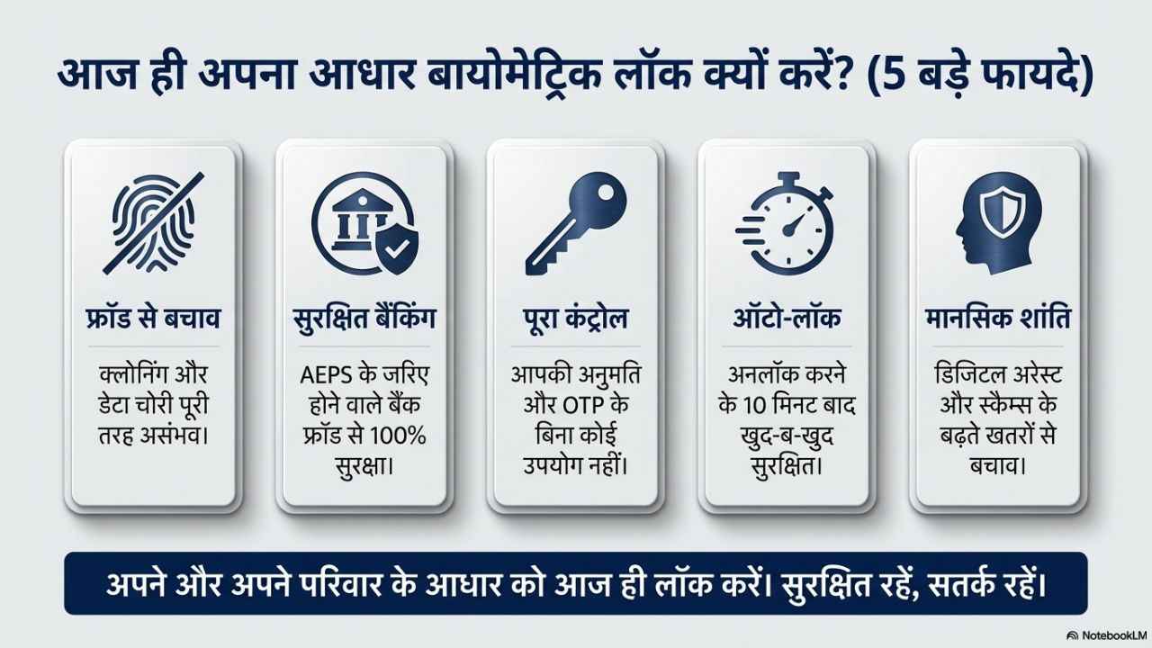 ये फीचर क्या करता है? आइए इसे डीटेल में जानते हैं। असल में, जब आप अपना आधार बायोमेट्रिक लॉक कर देते हैं, तो कोई भी व्यक्ति आपके फिंगरप्रिंट या आंख की स्कैन से कोई भी ऑथेंटिकेशन नहीं कर सकता है। यानी अगर कोई आपके अंगूठे की कॉपी बनाकर बैंक से पैसे निकालने या सिम लेने की कोशिश भी करे, तो सिस्टम उसे सीधे रिजेक्ट कर देगा। आजकल जो साइबर फ्रॉड और डिजिटल अरेस्ट जैसे स्कैम चल रहे हैं, उनसे बचने के लिए ये फीचर बहुत काम का है। आसान भाषा में आपके आधार कार्ड को इस्तेमाल में लेने के लिए आपकी मोहलत की भी जरूरत होने वाली है।