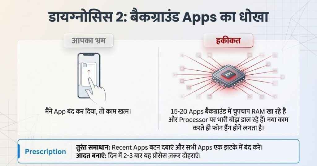 इसे आप फोन की ओर से हमें दिया जा रहा सबसे बड़ा धोखा कह सकते हैं। आप सोचते हैं कि आपने App बंद कर दिया तो यह बंद हो गया होगा, लेकिन हकीकत में यह ऐप बैकग्राउंड में चलता रहता है। RAM खाता रहता है। Processor पर बोझ डालता रहता है। जब एक साथ 15-20 Apps बैकग्राउंड में एक्टिव हों, तो फोन की RAM खत्म हो जाती है और हर नया काम करते ही फोन हैंग होने लगता है।