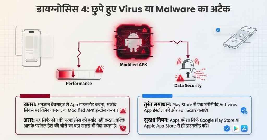 यह सुनने में थोड़ा डरावना लगता है, लेकिन यह सच है। अगर आपने कभी किसी अनजान वेबसाइट से App डाउनलोड की है, किसी अजीब लिंक पर क्लिक किया है या फिर कोई Modified APK इंस्टॉल किया है तो आपके फोन में Malware आ सकता है। इससे फोन की परफॉरमेंस पर असर तो पड़ता ही है, इसके अलावा आपका डेटा चोरी होने के खतरा भी होने लगता है। इस कारण से भी फोन बड़े पैमाने पर हैंग होने लगता है।