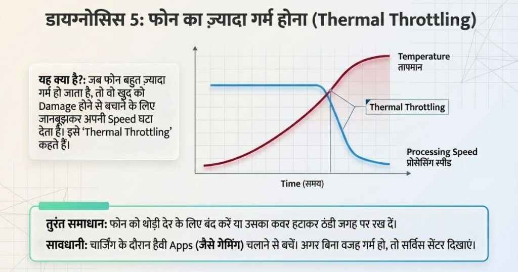 यह कारण सबसे कम लोगों को पता होता है, लेकिन यह भी बेहद जरूरी होता है। जब फोन बहुत ज़्यादा गर्म हो जाता है, तो वो खुद को Damage होने से बचाने के लिए अपनी Speed घटा देता है। इसे Thermal Throttling कहते हैं।