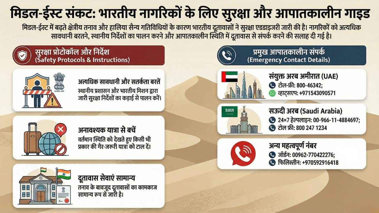 मिडल-ईस्ट में बढ़ते क्षेत्रीय तनाव के बाद खाड़ी देशों में स्थित भारतीय दूतावासों ने भारतीय नागरिकों के लिए सुरक्षा एडवाइजरी जारी कर दी है। रिपोर्ट्स आदि के अनुसार, हालिया मिलिट्री ऐक्टिविटी और हमलों के बाद स्थिति बिगड़ता देख ऐसा किया गया है। भारतीय मिशनों ने नागरिकों से ज्यादा से ज्यादा सावधानी बरतने को कहा है, इसके अलावा इस समय किसी भी तरह की यात्रा से बचने की भी सलाह दी गई है और सभी निर्देशों का पालन भी करने को कहा गया है। एडवाइजरी के साथ साथ बहुत से व्हाट्सएप और आपातकाल की स्थिति में इस्तेमाल में लिए जाने वाले नंबर भी शेयर किए गए हैं। हम नीचे आपको उन सभी की जानकारी देने वाले हैं।