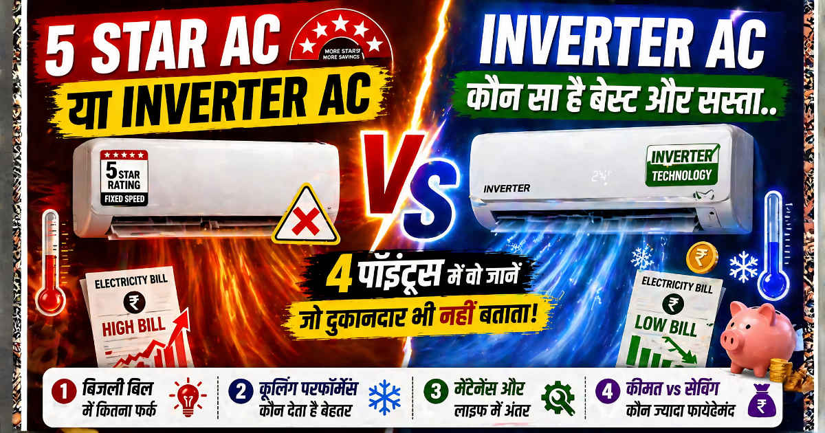 हमने ऐसा सुना है कि नया AC खरीदने दुकान पर जाते हैं, यहाँ AC के सैंकड़ों ऑप्शन मौजूद हैं, सभी के बारे में जानना बेहद ही मुश्किल हो सकता है। इसी कारण हम सेल्समैन की ओर से बताए या सुझाए गए Air Conditioner की तरफ ही मुड़ जाते हैं। कई मामलों में ऐसा देखा गया है कि जब भी यह 5 Star और Inverter AC के बारे में बताना शुरू करता हैं तो अगर आप तकनीकी से वाकिफ नहीं हैं तो आपका सिर जकरा सकता है, क्योंकि आप अब इन दोनों के बीच में ही कन्फ्यूज हो जाने वाले हैं कि आखिर आपको किस AC को खरीदना चाहिए। कौन सा AC आपके लिए बेस्ट हो सकता है। असल में, दोनों नाम सुनने में बिजली बचाने वाले लगते हैं लेकिन फर्क क्या है यह समझ से परे की बात लगती है। इसी कारण हम आपको आज इन दोनों के बीच के अंतर को समझाने और बताने वाले हैं। 5 Star AC और Inverter AC के बीच में असल फर्क क्या होता है और कौन सा AC आपके पैसे बचाने के अलावा आपके बिजली के बिल को भी कम सकता है। इस बारे में हम 4 पॉइंट्स में समझने वाले हैं। आइए शुरू करते हैं और इनके बारे में जानते हैं।